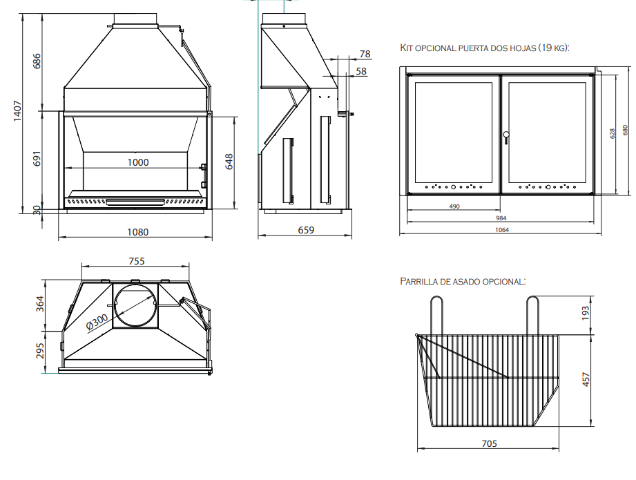 Dim. (ancho x prof. x alto) 1080 x 659 x 1407 Peso 165,8 Kg Combustible Carbón vegetal o leña