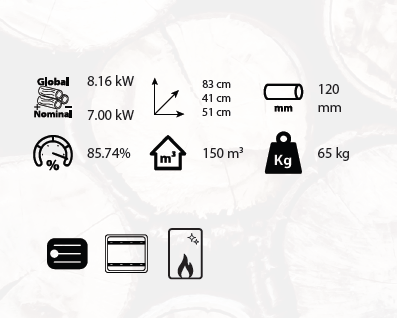 Dispone de salida de humos de 120 mm y espacio inferior para almacenar leña, ofreciendo funcionalidad y estética en un solo equipo. Perfecta para quienes buscan confort, estilo y sostenibilidad en la calefacción de su hogar.